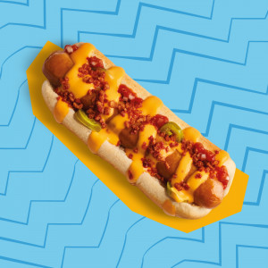 Pork Bendy frankfurter, cheese slice, tomato, onion, Wimpy Ketchup, toasted glazed bun. 535 Kcal. This item contains Wheat, Milk. May contain Sesame. Allergens may also be transferred from the cooking oil.