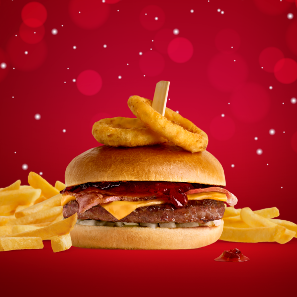 For a limited time only, this December enjoy our classic beef patty, bacon, cheese & cranberry sauce in a toasted glazed bun, topped with 2 battered onion rings and a side of chips.